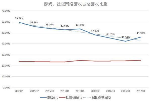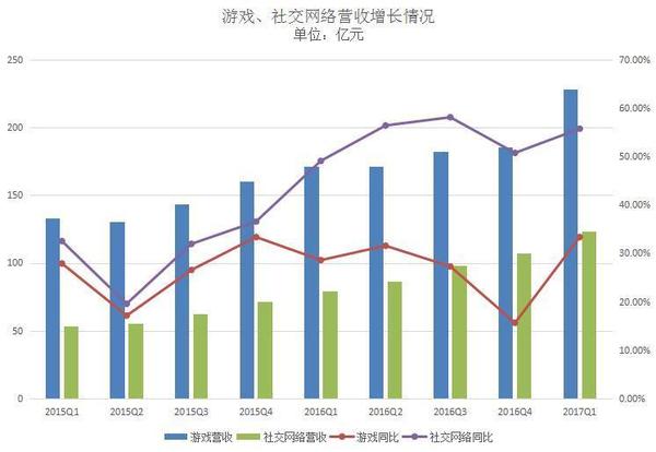 在騰訊發(fā)布新一季度財(cái)報(bào)之前,一眾剖析師都非常看好。而在這之前,羅永浩曾直言“騰訊股市漲得比北京房?jī)r(jià)好”。那么騰訊新一季度的效果到底有剖析師所猜測(cè)的那么好嗎?別的收割很多玩家的《玩著榮耀》游戲又給騰訊奉獻(xiàn)了多少收入? 5月17日,騰訊發(fā)布了2017財(cái)年第一季度的效果陳述。該季度公司的營(yíng)收為495.52億元(71.82億美元 ),同比增加55%;運(yùn)營(yíng)盈余192.72億元(27.93億美元),同比增加44%;公司權(quán)益持有人應(yīng)占盈余為144.76億元(20.98億美元),同比增加58%。 作為早年建立的互聯(lián)網(wǎng)公司之一,騰訊的開展也閱歷了幾次大的戰(zhàn)略調(diào)整。從近來兩年的財(cái)報(bào)數(shù)據(jù)來看,公司的營(yíng)收和凈利潤(rùn)增速在持續(xù)上升且創(chuàng)了新高。但在2015Q2和2016Q4這兩個(gè)季度,營(yíng)收曾遭受下滑。 騰訊開始以及時(shí)通訊東西發(fā)家,現(xiàn)在公司的事務(wù)現(xiàn)已掩蓋游戲、交際網(wǎng)絡(luò)、付出、云核算等。從營(yíng)收構(gòu)造來看,公司首要有增值效勞事務(wù)營(yíng)收、網(wǎng)絡(luò)廣告事務(wù)營(yíng)收和別的事務(wù)營(yíng)收三大首要來歷。其間,增值效勞事務(wù)依然為公司奉獻(xiàn)了最多的收入。 游戲立異高,占總營(yíng)收比重有所上升 作為騰訊最掙錢的事務(wù)大頭,該季度公司的增值效勞營(yíng)收同比增加41%至351.08億元。 其間,來自網(wǎng)絡(luò)游戲的收入增加34%至228.11億元。游戲事務(wù)增加首要由智能手機(jī)游戲(如《王者榮耀》、《穿越前方:槍戰(zhàn)王者》及《龍之谷》)及PC客戶端游戲(如《英豪聯(lián)盟》、《FIFA Online 3》及《地下城與勇士》)所奉獻(xiàn)。盡管這次騰訊沒有發(fā)布《王者榮耀》的詳細(xì)效果,但上個(gè)季度公司曾泄漏游戲的日活潑用戶超越了5000萬。 詳細(xì)來看,來自PC客戶端的游戲收入為141億元,同比增加24%;來自智能手機(jī)游戲的收入為129億元,同比增加57%。 別的,來自交際網(wǎng)絡(luò)的收入增加56%至122.97億元。該項(xiàng)收入增加首要反映數(shù)字內(nèi)容效勞(包含數(shù)字音樂、視頻及文學(xué)效勞)及虛擬道具銷售收入的增加。 近來幾年,經(jīng)過自研IP游戲、代理游戲以及“買買買”的方法騰訊現(xiàn)已是全球最掙錢的游戲公司。正如剖析師所猜測(cè)的,騰訊的游戲收入又帶來了“驚喜”——創(chuàng)了前史新高。 不過,為了疏解收入構(gòu)造單一帶來的潛在危險(xiǎn),騰訊一向都在擴(kuò)大別的事務(wù)的營(yíng)收,然后降低游戲在總收入中的占比。 從游戲和交際網(wǎng)絡(luò)營(yíng)收增速的比照?qǐng)D來看,近來兩年時(shí)間里前者都要慢于后者。從這兩項(xiàng)事務(wù)占公司總營(yíng)收的比重來看,交際網(wǎng)絡(luò)一向保持在20%-30%之間。而游戲收入占比則在直線降低,在2016Q2降低至50%一下,在2016Q4占比僅為42.14%。但到了該季度,占比又有所上升。 網(wǎng)絡(luò)廣告營(yíng)收增速趨于穩(wěn)定,交際廣告同比增加67% 除了游戲外,網(wǎng)絡(luò)廣告算是騰訊要點(diǎn)規(guī)劃的事務(wù)之一了。 在這之前,騰訊曾調(diào)整了廣告事務(wù)的人事錄用,以進(jìn)一步挖掘該事務(wù)的潛在價(jià)值并提高它的戰(zhàn)略地位。此前還有業(yè)內(nèi)人士剖析認(rèn)為,未來騰訊也許會(huì)開展成了一個(gè)以廣告事務(wù)為主的公司,比方廣告營(yíng)收占比高達(dá)85%的Facebook。 該季度網(wǎng)絡(luò)廣告的營(yíng)收同比增加47%至68.88億元。但比較2016Q3和2016Q4的74億元和83億元?jiǎng)t有所降低。從曩昔兩年的數(shù)據(jù)來看,來自網(wǎng)絡(luò)廣告的增速現(xiàn)已離別之前動(dòng)輒三位數(shù)的增加,而保持在40%-50%之間。 從廣告占總營(yíng)收的比重來看,比較前幾季度也有所降低,為13.91%。這一數(shù)字要低于交際網(wǎng)絡(luò)在總營(yíng)收中的占比。關(guān)于廣告事務(wù)的開展,騰訊現(xiàn)已在國(guó)內(nèi)外進(jìn)行積極的規(guī)劃,不知道終究是否能取得不錯(cuò)的效果。 在該季度,騰訊對(duì)廣告事務(wù)的詳細(xì)區(qū)分進(jìn)行了調(diào)整。不再是效果廣告和品牌展現(xiàn)廣告,而是按廣告特點(diǎn)和非廣告特點(diǎn)來區(qū)分: